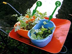 ● 苗の選別 ● (1)スイカの苗(縞玉マックス) (2)プリンスメロンの苗 尾花沢スイカの良質な苗を販売している尾花沢市の園芸店から苗を購入。元気の良い勢いのある苗を選ぶ。 1998.5.7 |