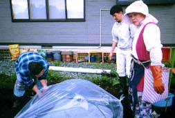 ● 苗を定植 ● 雨の晴れ間に手際良く苗を定植させる。(本格的なスイカ栽培は4/20〜4/30ごろ。少し遅れての定植) ビニールハウスを設置の際、新兵器を発見! 1998.5.7 |