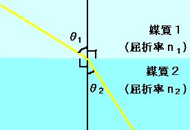 1.屈折の法則 光や音が異なる媒質の境界で屈折するばあい、その屈折する角度はそれぞれの媒質での波の速さに関係します。また、その速さの比のことを屈折率と呼んでいます。式にすると、n2/n1=sinθ1/sinθ2=v1/v2(添え字の1と2は、それぞれ媒質1と2を表す。n:屈折率(真空及び空気の屈折率を1としたときの相対値)θ:角度(下図参照)、v:波の速さ)です。