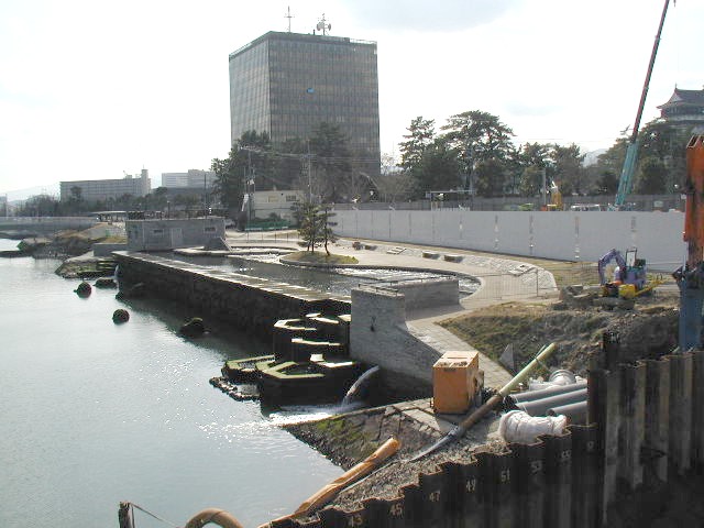 紫川の小倉城側の川辺は、公園。その先は 現在「リバーウオーク北九州」の建設工事中。