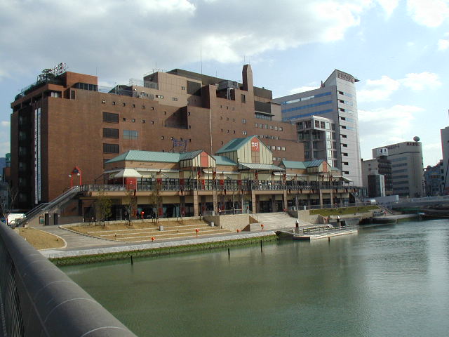 紫川の井筒屋側。小倉リバーサイド・チャイナ 茶色の旧井筒屋の向こう側に新館の井筒屋が みえる。