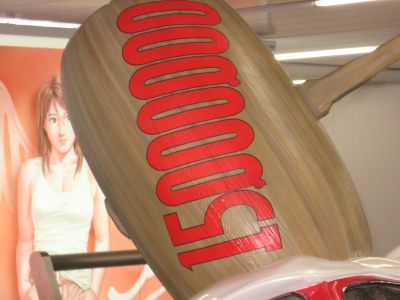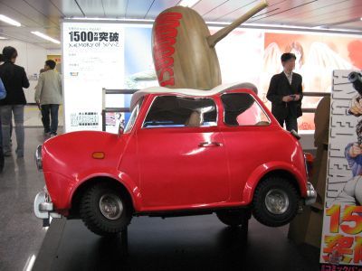 車の屋根に埋まる、1500万部突破記念の“1500万tハンマー”。