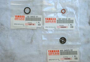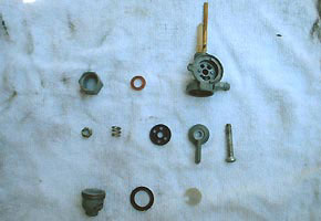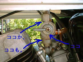 ガソリン・コックから漏れているとすれば、タンクとコックの接合部のガスケット(赤いやつ、ね)か、レバー部分のガスケット(4つ穴の空いたゴムのやつ、ね)、またはフィルター部分のガスケットが疑われます。