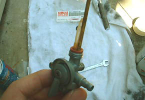 さ〜て、たまにはメンテしてやるか♪そう言えばヘッドランプのバルブも切れたままだしな〜と久々にGR君を出してやったらなんと、お漏らししているではないですか!先日の「YAMAHA old mini 2st meeting」に向けてバルブシートASSYを新品に交換し、キャブもO.H.したので、もう大丈夫だろう、と思っていたら今度はコックからでしたぁ!