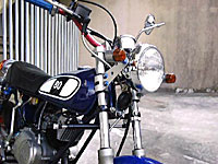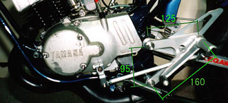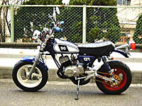 サイドスタンドは純正のままだと短かすぎてバイクが倒れてしまうので、他に使えるものを探します。ミニトレのスタンドは取付穴の中心から先端までの長さが約210mm、これに対して約50mmほど長いものを探すことにします。これは先述の解体屋で店員の目も気にせず、あらゆる車種のスタンドの長さを測って回りました(笑)。