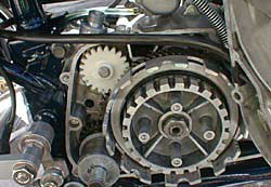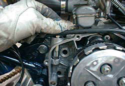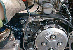 まずはミッションオイルを抜いて、クランクケースカバーを割ります。ガスケットがへばりついているので、カッターできれいにそぎ落としてからオイルストーンで合わせ面を磨きました。