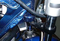 実際にハンドルを切ってみるとかなり切れ角が少なく感じられますが、どうでしょうか。長年の懸案であったハンドル・ストッパーが一応の完成となりました。とりあえず、タンクに当たる心配が無くなり一安心♪ |