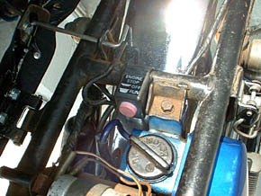 「スイッチOFF」でバッテリーのアースラインを遮断する仕組みです。この類のスイッチは既にGT、GRにも取り付けて実証済みですが、長期に乗らないときにこれをOFFしておくとバッテリーの自己放電を最少に抑えることができます。
