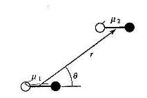 2.(a)二つの双極子μ1とμ2が、右図に示すような双極子の向きは平行である並び方をしていて角度θは固定されている時のポテンシャルエネルギーVをあらわす式を求めよ。ただし、真空中での誘電率をε0、2つの双極子の重心間の距離をrとする。