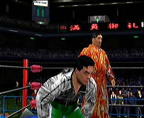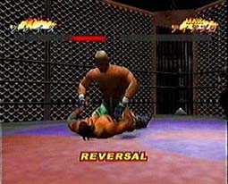 さて、これも前作からの継承といって言いのかどうかは分からないが、はっきり言ってキャラが少ない!まあ、プロレスゲームの専門家が作ってるわけではないので、この辺で我々とは感覚にズレが出て来るのかも知れない。格闘ゲームとしては十分なキャラ数だからね。キャラと言えば、前作に引き続き、バーチャファイターからウルフとジェフリーが参戦(全日のウルフもちゃんといる)、さらに今回から新たに影丸も登場した。「そんなものを入れるぐらいなら、小川良成やノーフィアーを入れろ」という全日ファンの怒りの声が聞こえてきそうだが、バーチャではカゲ使いだった筆者個人としてはまったくノー問題(^^;;;。