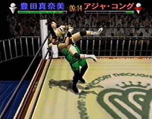 珍しい点としては、入場シーンが実写ムービーであるという事。あと、試合中は、ちゃんと「とよた〜!」とか「あさり〜!」など相手の名前を叫びます。このへんは“実名レスラー登場ゲーム”の強みか。でも、試合中のそういった叫び声は、あまり臨場感がないです(^^;;(スタジオで収録したらしい>叫び声)。
