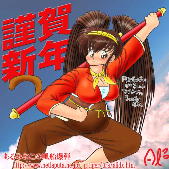 | 早いモンだよね、もう2004年だもんね… あけまして、おめでとうございます。 光陰矢のごとくとは言ったもので、このサイトももう七年目です。 申年…西遊記ネタは、基本ですよね? でもおーちゃんにしてみれば“ドラ○ンボール”だけは避けたかったはずです。 (メジャー(一般)過ぎるネタは、自称「ヲタ・マスター」のプライドが関わるとか) 今回は、格ゲー“マーヴルVSカプコン2”の「ソンソン」。大元はかなりのレトロゲーム 他にも“ぷろG”とか“最遊記”とかいろいろ候補あったんだけど…程よいマイナー加減が好き (2004/01/01)…とゆー事にしといてね | ||