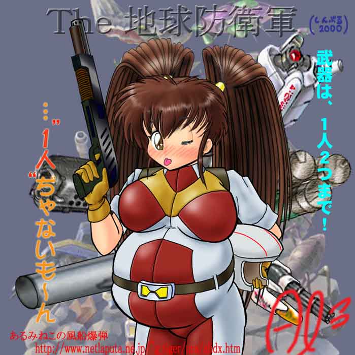 | ちと遅いですが、ハマってます記念…だったりするです。 プレステ2の「シンプル2000」シリーズに『The 地球防衛軍』ってのがありますが、 コレがまた、ムチャクチャに面白い。1Pと2Pの“たった2人の防衛軍”が、わらわらと迫り来る敵を撃ちまくる爽快感… “BGM曲数が少ない”、“乗り物&敵の種類が少ない”、“携帯可能な武器が2つまで”…とか欠点も無い訳ではないんですけど、 そんな事が気にならない位、萌え…いや燃えます。2000円って値段ぢゃなくっても絶対にお徳!おすすめ! 基本的に自キャラは後姿(良くて横向き)までしか見えないんで デザインちとあやふやっス 武器なんか、ホントにテキトーなんで、深くツッコまないでね しかしまー、1人武器2つまでって制限は何故なんでしょね…さて、今この絵にいるのは何人? 背中とオナカに大荷物抱えちゃって…アリに齧られてパンクしたって知らないからね(笑) (2003/09/21) | ||