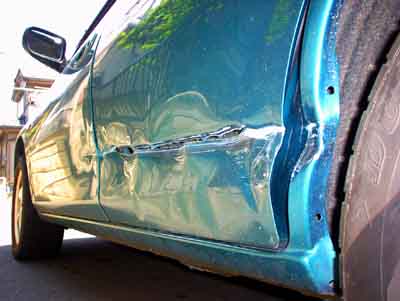 ボディパネルが布のようにパックリと引き裂かれ、内装パネル裏側が見えています。