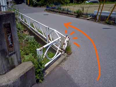 いったい何が起きたのか。見渡してみて納得。ガードレールのポールが傾いており、その先端が突き刺さったまま左折したのです。