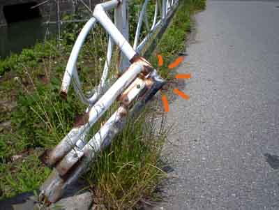 以前に起こした事故直後のもので、後輪から側溝のコンクリートに激突したなれの果てです。