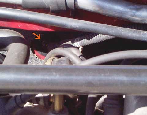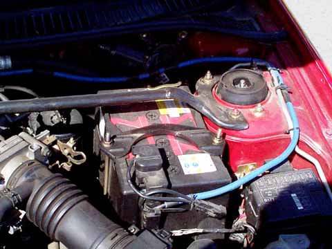 エンジンルームへの配線は、エンジンルーム奥中央よりわずかに左のここから車内に引き込みます。