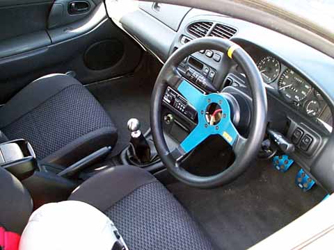 ブルーアルマイトで統一されたステアリングスポークとペダルが美しい室内。
