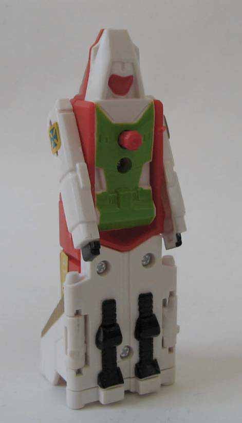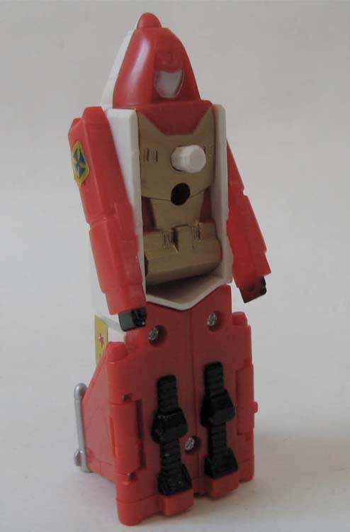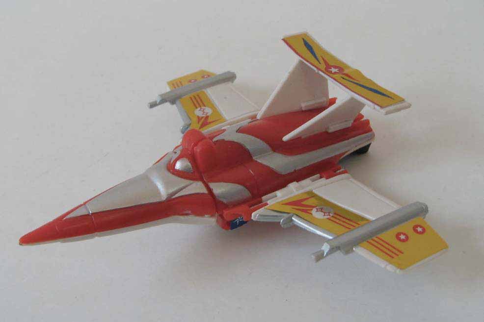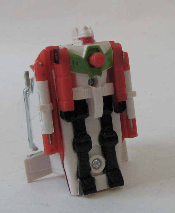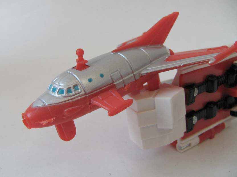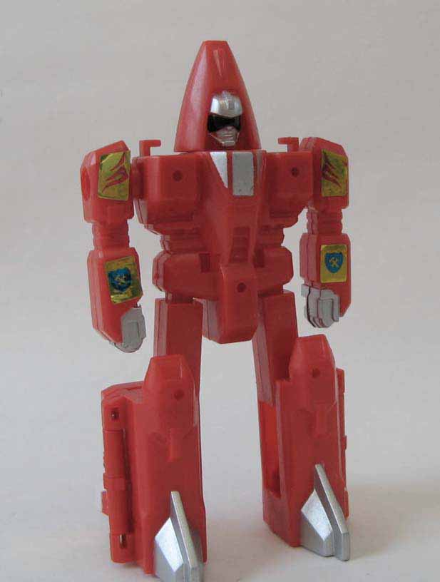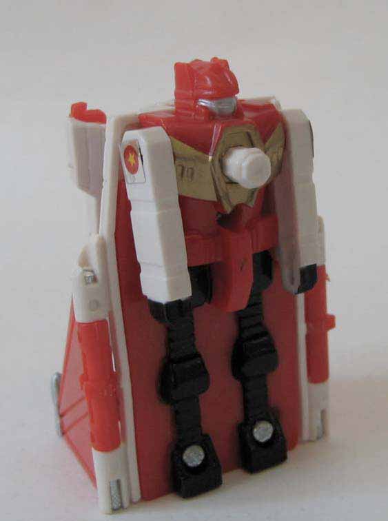 | ロボットモード 手足ロボの変形はかなり単純、翼などを畳んで本体を直立させるだけ。 スカイロボの足の伸縮ギミックも省略されている。 ジェットビートルはスカイロボの簡単なリデコだが、ウルトラホーク、マットアローはまったくの別物。 マイクロTFのコピーにこれらと酷似したものがあるので、それからのリデコではないだろうか? |