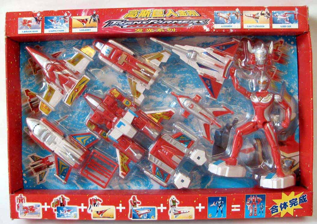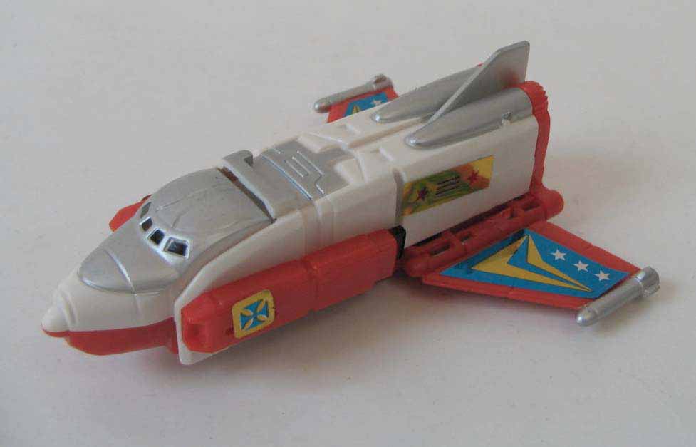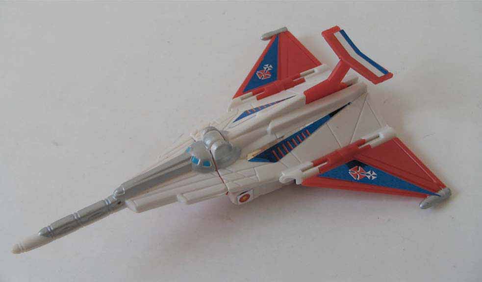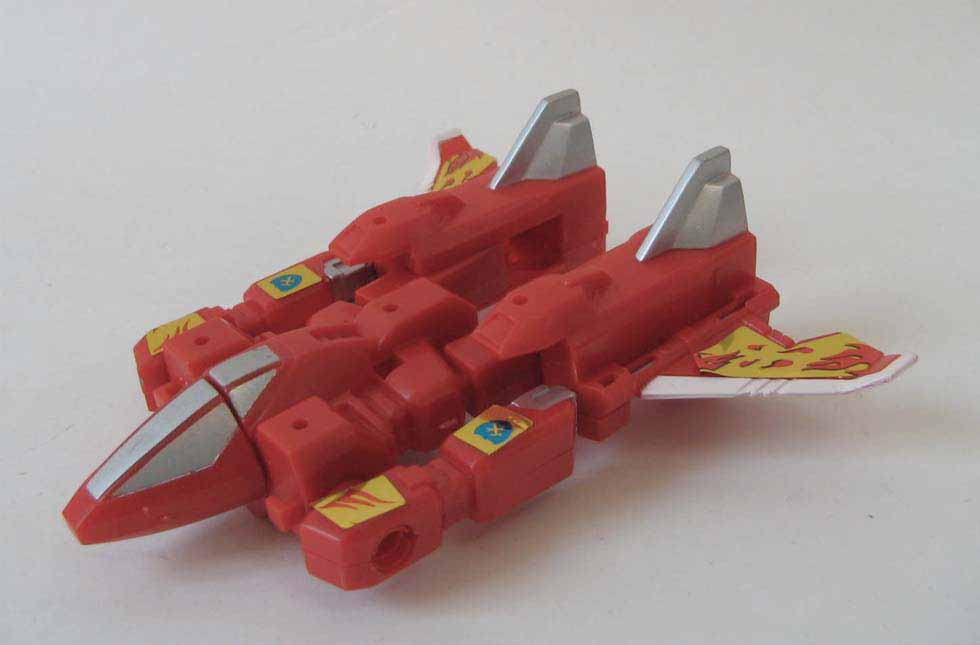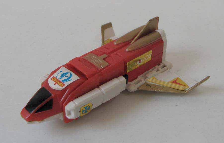 | ロボットモード 手足ロボの変形はかなり単純、翼などを畳んで本体を直立させるだけ。 スカイロボの足の伸縮ギミックも省略されている。 ジェットビートルはスカイロボの簡単なリデコだが、ウルトラホーク、マットアローはまったくの別物。 マイクロTFのコピーにこれらと酷似したものがあるので、それからのリデコではないだろうか? |