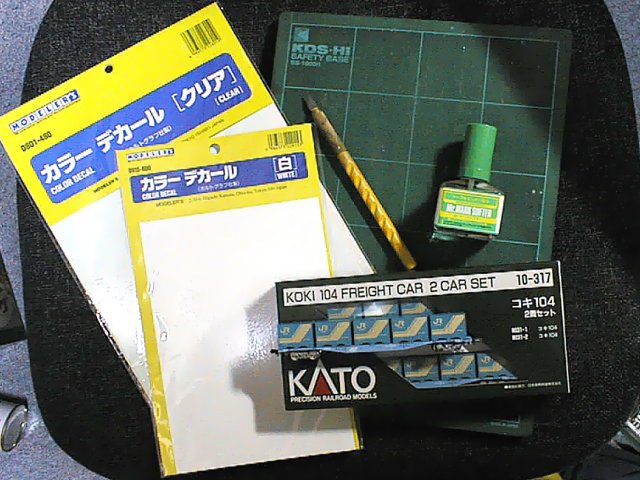 まず用意するモノですが、材料1,2の写真にあるカラーデカール(クリアー、白)、マークソフター、デザインナイフ、プラ棒、両面テープ、種車(今回はKATOのコキ104を使用)