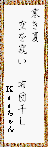 | Kiiちゃん、今年は天気が悪くてお布団干しもままなりませんでしたね。でも残暑が厳しい。 |