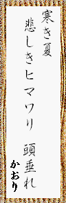 | 自薦。涼しい夏でヒマワリが下を向いてるのが哀しくて詠みました。季節外れに上を向いたのだろうか。 |