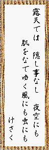 | けさくさん、露天は最初夜店のことかと思っちまった。露天風呂ね、気持いいよねぇ。 |