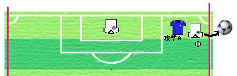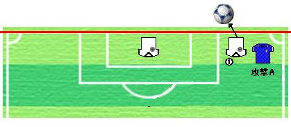 攻撃Aの攻撃を阻止しようと、守り@が図の赤線(タッチライン)から外にボールを出した場合、これは攻撃チームのフリースロー(両手で投げ入れる)となります。 |