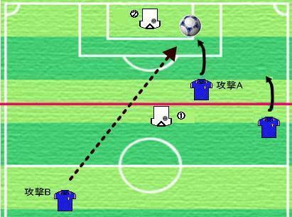サッカーの中で一番わかりにくいルール。図の赤線より上側(相手陣内で相手の一番ゴールに近い選手@がいる位置(最終ライン)からゴールまでのエリア)をオフサイドポジションと言います。 攻撃Aがこのオフサイドポジションにあらかじめ位置する状態で、味方の攻撃Bが攻撃Aにボールをパスするのがオフサイドです。つまり攻撃Aと相手A(通常GK)との間に相手選手がいない状態で攻撃Aにパスをするとオフサイドになるのです。 しかし、もし攻撃Bがボールを蹴る時点で、攻撃Aが図の一番右のようにオフサイドポジションに入っていないのであれば、走りこんでパスを受けるのはオフサイドにならないのです。う〜ん、難しい.... じゃあ、なぜオフサイドは反則なのかというと、こうした行為は相手ゴール前で待ち伏せをしている事となり、卑怯であると考えられていたためらしい。 この図は以下のサイトから引用させてもらいました。オフサイドの判定には、もっと細かなルールがたくさんあります。詳しく説明されているので興味があればご覧ください。 http://www.mzfactor.net/offside.htm |