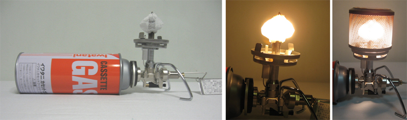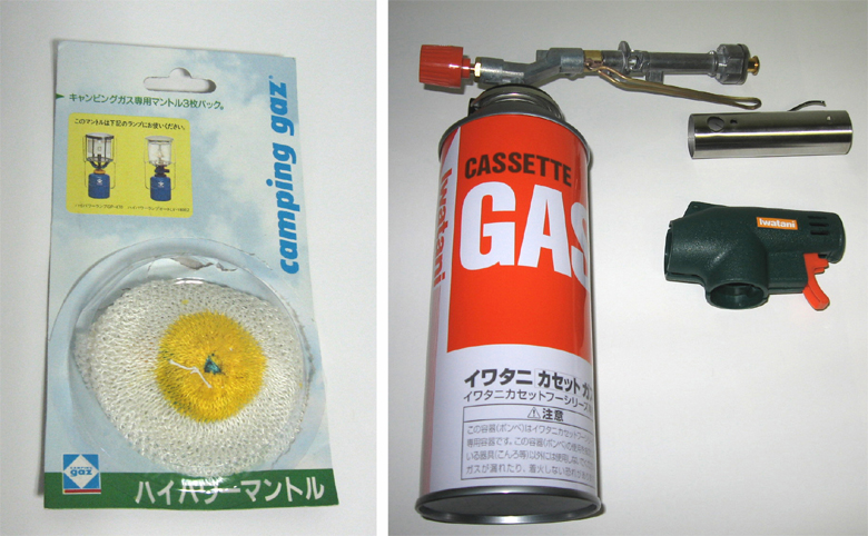 何年か前にネットで、「瓦斯灯」で検索したがマントルを販売しているお店はヒットしなかった。いつか灯りをつけてやろうと思っているうちに年月だけは経ってしまった。今年は還暦、残された時間の方が少なくなって来た。ネットで「ガス灯 マントル」で探しまくったら、キャンプ用品でカセットガス使用の瓦斯灯が販売されていた、マントルのみ別売3個入りで945円也。(写真左)LPG(液化ブタン)用だ。家庭用天然瓦斯で使用してもたいして変わらないだろうと、いい加減な判断で購入した。エアーソフトガンにフロンガスの代わりにブタンガスを詰めてもBB弾は発射可能である。ほんの少し威力が減り。ほんの少し危険度が増すだけである。併し私はA型、疑り深いし、用心深い。カセットガスからも使える様に「カセットガス・トーチバーナー」も購入した、1600円也。分解して不必要な部品をすべて捨て、カセットガス缶に装着し、ハンドルを廻せばLPGの噴出量を調節出来る状態にした。(写真右)。 早速カセットガスでマントル無しの瓦斯灯に点火してみた。