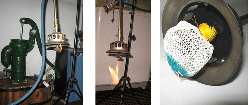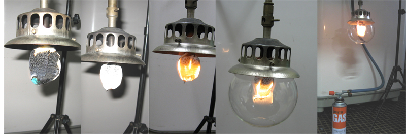 少し火を点けてみた。焦げた。(写真左3葉)更に燃やすと白くなった。これで準備は完了。本格的に家庭用ガソを流して火を点けてみた。あまり明るくはないが、ロウソクよりマシである。ガラスのホヤ(火屋)を被せてみた。(写真中2葉)やっと落ち着いた感じになる。終戦後、まだ進駐軍がいた時代の灯りを、平成に家庭で再現。灯りを見ていると心が和む。併し場所が分娩室なので少し興が醒める。用心深い私は、危険を伴う火遊びは、井戸端や、換気も良く、床がタイル張りの分娩室で行う。