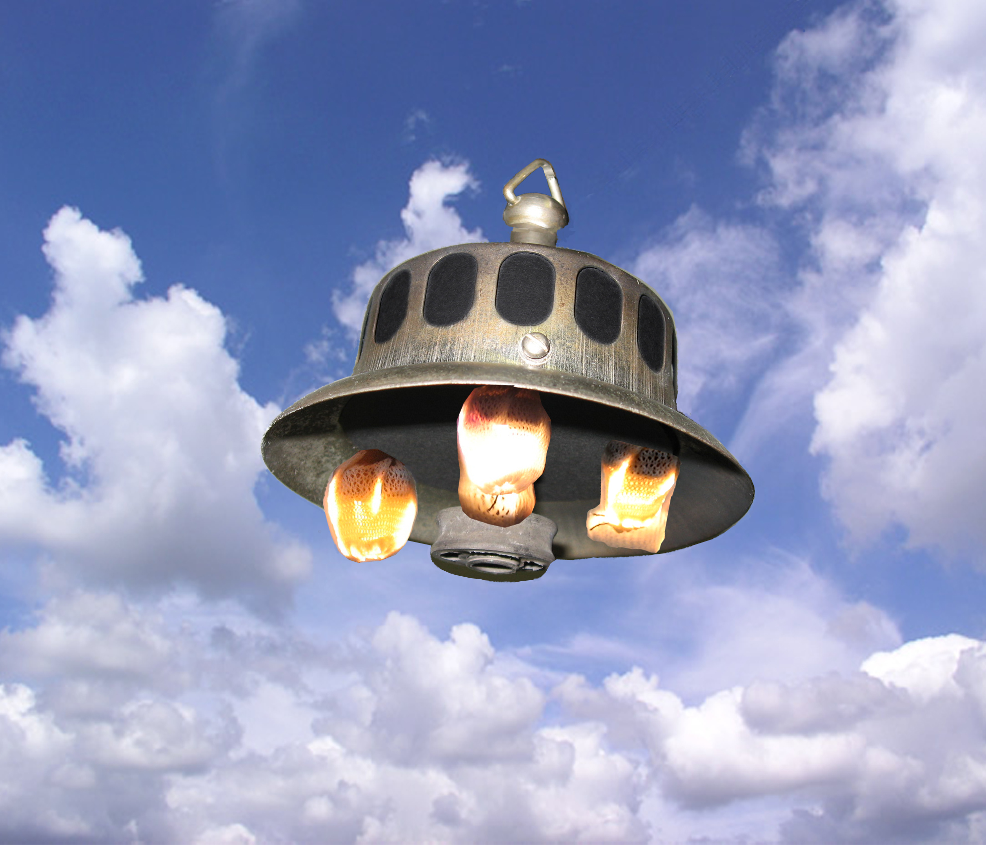 我が家の瓦斯灯はよく見るとアダムスキー型の空飛ぶ円盤に良く似ている。ジョージ・アダムスキーが円盤の写真を撮影したのは1952年であるから、似たような瓦斯灯はいくらでもあった筈である。火屋を外して、ピンポン玉の半切を3つ接着して、例の写真を撮ったのでは無かろうか?