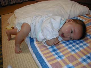 今日、ボクは生まれて初めての寝返りに成功しました!! この2〜3日は頑張っても横を向くだけだったのが、今日は大成功です。 ほら、こんなに首だって持ち上げられるんだゾ。