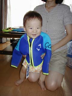 今日、水中造形センターから宅配便が届きました。 何かと思って箱を開けてみたら・・・。 マリンダイビングフェア(今年の4月4日の日記を見てね)でママが応募した モニターに当選したんです。 賞品は、「ジュニア用ウェットスーツ」。 今はまだちょっと大きいけど、早くこれを着てダイバーの仲間入りをするんだ。 パパとママは大喜びで、この夏の暑い中、ボクは無理矢理着せられちゃった。