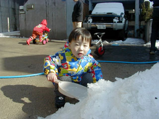 お手伝い きのう、雪が振ったので、今日は朝から雪かきです。 ボクもお手伝いしました。 この上着、スキーウェアっぽくって可愛いでしょ!?
