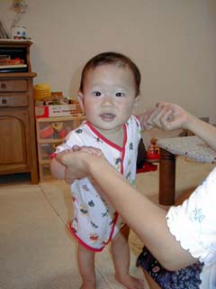 午後から久利子おばちゃん(ママの妹)の家へ。 果歩ちゃん(1歳)が歩いているのを見て、 私も刺激を受けて、急にタッチができるようになりました。 お風呂の中でちょっと練習したら、簡単にできちゃった。 今まで、全然気配がなかったので、パパとママはビックリ!! カメラやビデオを取り出して、大騒ぎしてました。