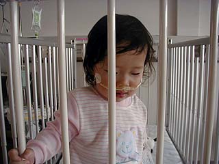 先週、お兄ちゃんからうつされちゃったカゼがひどくなって、 気管支炎になっちゃいました。 昨日から都立荏原病院ってとこに入院してるんだけど、 鼻にヘンなチューブを入れられるし、左手はずっと点滴だし、 夜になるとママはいなくなっちゃって淋しいし、 やっぱり病気はイヤだなぁ。