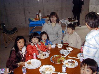 今日はきんじょの人ともちつきをしました。 雪が降っていたので、ガレージの中で作りたてのおもちを食べました。 こっちは女の子チームです。