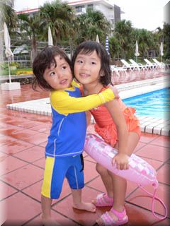 朝からやっと飛行機が飛んだのに、わたしたちが乗るはずだったプロペラ機だけ飛びません。 仕方がないから、やっと入れるようになったプールで遊びました。 ありさちゃんと仲良くツーショット。でも、ちょっと寒かった〜。