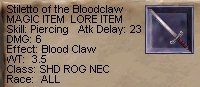 | 明日はちょっと早く出かけなくては成らないので、Qeynos地下でちょっとだけBARDを育てていました。例によってスマグラ君虐めです。何とかLevel11まで上げて、今日は終わりにしました。Mana Songが歌えるようになるのは・・・・ず〜っと先・・・いや、無いかも・・・・ね。何故か2ndでBARD育ててる人がいないのですが、やはり育てるの大変みたいですね・・・・BARDって・・・ ^^;; |
