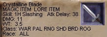次は、もうちょっと上手に出来るといいな。Odentはじめ、皆さんにお手間を取らせちゃいました。次回頑張るので勘弁です。で、Vox様は倒せなかったのですが、最後の方にひょっこり現れたGoblin Champion君からクリスタルブレードが出た模様。Lottしたら、ちゃっかりSellineが勝ってしまいました。^^;;