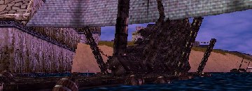 | 大型船に乗り換えて、更に暫く進むと、zoneして、ようやくOverthereの村が見えて来ました。筏に乗ってから、ちょうど30分位かかった模様です。リアルの1時間14分位で、EQの世界の1日のはずですから、およそ半日の船旅なのですね・・・それを考えると、あまり遠くでは無い感覚でしょうか・・・・ |