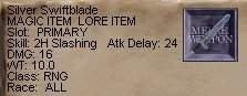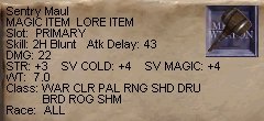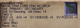 昼間の時間帯、ふらふらとSoV方面にやってきたTamy。まずはThurgadinの町にはいって、なにか面白い物が無いかと物色を始めます。Vox戦の時にしか使わないかも知れませんが、SVC+10のRangeスロットに入る短剣が売っていたりして、サーバーダウンの翌日辺りに見てまわると、なかなか楽しいですよ。