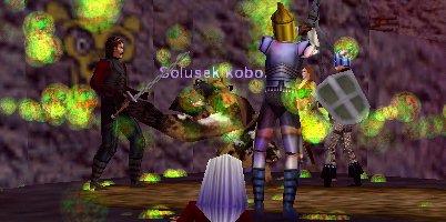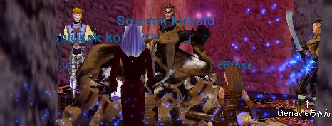 | SS Roomへ行こうという事になり、進軍を始めた今日のメンバ〜。が、Sol B Zoneに入ったところでNox Trainに遭遇!、うはは!・・・・で、当りItemのGCBをGet。ついでに立ち寄ったBat Roomで、蝙蝠君たちと戦闘中になんとGuano君がのそのそと・・・・で、重量軽減バッグをGet。その後SS RoomでStone Spider君から玉2個とDRU鎧1個をGet。^^;; |