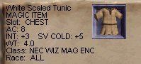 | Named君(名前忘れた・・・^^;;)から、Robeがでて、なんとMottyがLottoに 勝ってGet!早速Tamyに装備させました。INTもさることながら、STRも上がっ てくれるので、かなり嬉しいかも! ^^;; みんなありがと〜! |