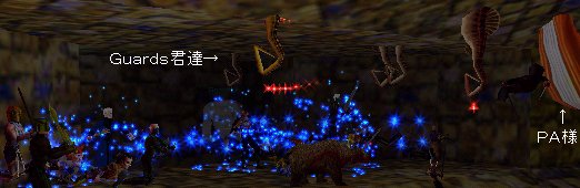 寝かしきれないGuardsに絡まれて瀕死のNariyo。MottyのHealが飛びます!飛びます!このTeamは、Odent・Nariyo・Mottyの3人なので、MottyがMain Healerです。で、宿命の如く、Heal Tauntと成り、Motty撃沈。Odent・・・・Nariyoを頼む・・・・(チョット心配)・・・・。
