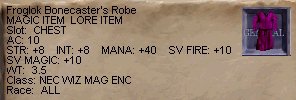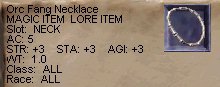 そこいらの雑魚Orcが落して行く首輪。 LOREなのですが、良く出るみたいです。 けして悪いステータスじゃあないのですが、 ここではゴミに成りそう・・・・。 |