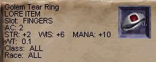 Golem君出るたびに指輪〜!等と叫んでいたら、あら、本当に落して行ってくれました。今までかなりの数のGolem君を虐めて来ましたが、指輪を持っていたのを見たのは今回が始めて!更にLottoに勝って、MottyがGetです。うれし〜! ^^ 。 |
