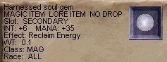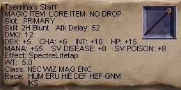 最上階の鍵の他に、左の二つのアイテムを落して行きました。 ひとつはMAG専用のGemで、INT+6、effectに召喚生物を消してManaに変える魔法付きのものでした。残念ながらMAGがいなかったので壊すことに。 もうひとつはピュアキャスター用の杖。この杖、最近時々見かけるなと思っていたら、ここの産物だったのですね。ピュアキャスターはKezuしかいなかったので、KezuがGetです。外見ユニークだし、ステータスもなかなか良いですよね。Kezuおめでと〜! |